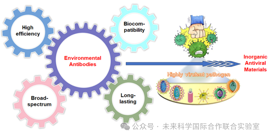 图一: 具备长效、高效、广谱及生物安全特性的无机抗病毒材料的设计策略