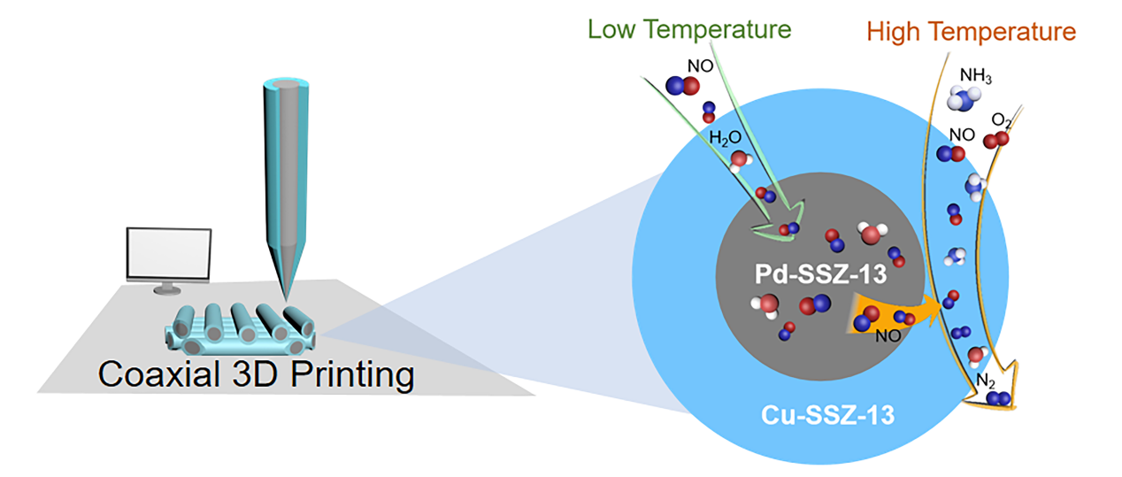 图一: 同轴3D打印的Pd-SSZ-13@Cu-SSZ-13分子筛核壳催化剂用于冷启动下NOx吸附和选择性催化还原耦合示意图