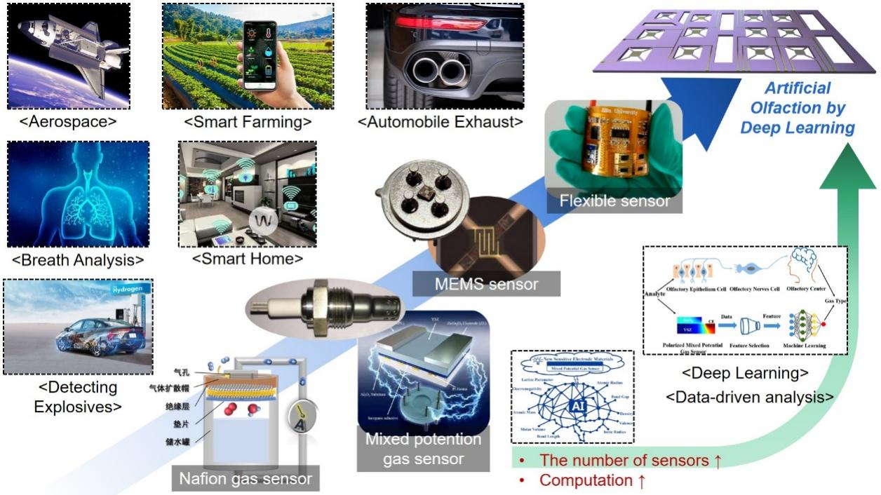 We developed a set of low-power-consumption, mini-size, integrated, intelligent and high-performance gas sensors by the fusion of nanomaterials technology, micro/nano processing technology and artificial intelligence algorithm, for the applications of environmental monitoring, industrial production, safety protection, aerospace, breath analysis, smart home & farming, and other fields. These gas sensors mainly include MEMS semiconducting-type gas sensors, solid electrolyte-type gas sensors, fuel cell-type gas sensors, flexible & wearable gas sensors, etc.