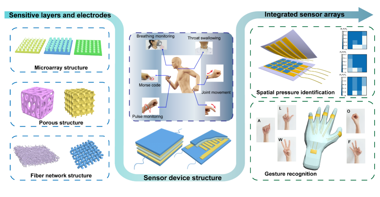 Focusing on the fields of electronic skin, human-computer interaction, health monitoring and healthcare, we developed a series of sensitive layers and electrode layers with micro/nanostructures (such as micro arrays, porous structures, fiber network structures, etc.) to construct flexible wearable pressure sensors with high sensitivity, wide detection range, and fast response characteristics, achieving real-time monitoring of human pulse, respiration, swallowing and joint movement. Furthermore, we used integrated flexible pressure sensor array and artificial neural networks for realizing spatial large area pressure distribution recognition, gesture recognition, and pressure distribution visualization.