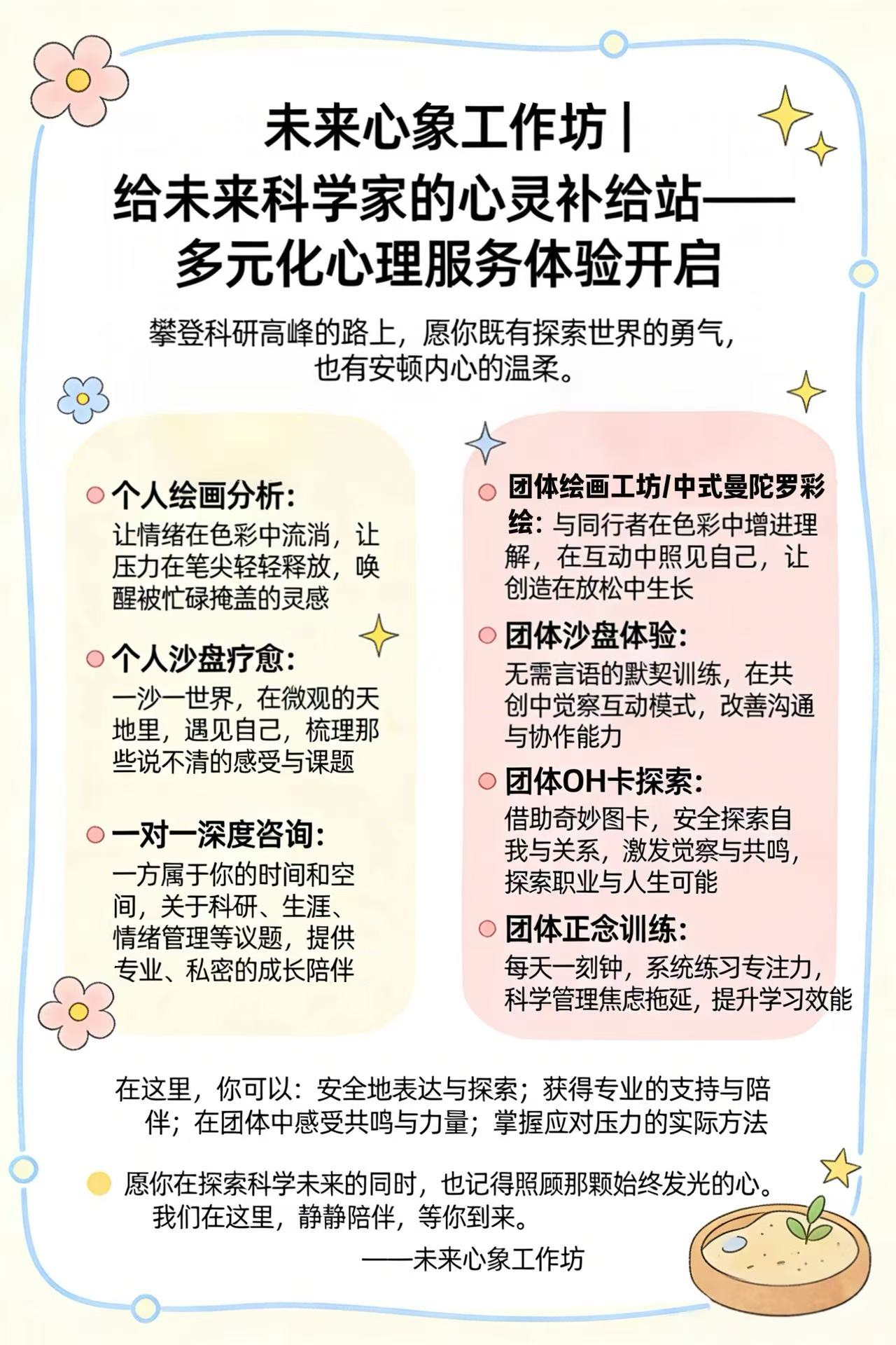 为守护科研学子的心理健康,为科研之路注入温暖力量,未来科学园未来心象工作坊精心搭建了涵盖个人服务与团体体验的多元服务体系,打造专属未来科学家的心灵补给站,让每一位探索者在追求真理的同时,亦能安顿内心,收获成长。